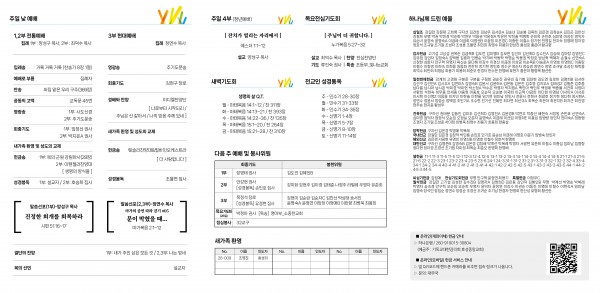 - 중보기도: 매주 수요일 오전 10시, 매주 주일 3부 예배 후 / 2층 기도실