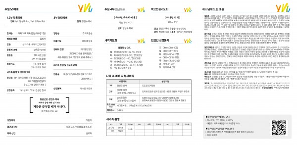 - 중보기도: 매주 수요일 오전 10시, 매주 주일 3부 예배 후 / 2층 기도실