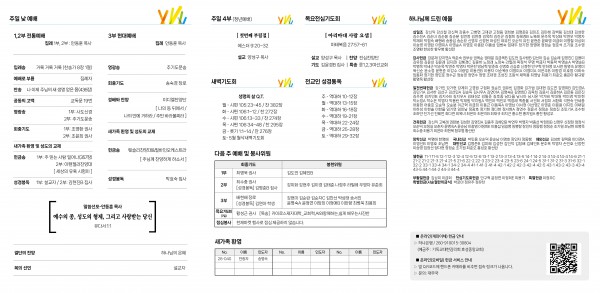 - 중보기도: 매주 수요일 오전 10시, 매주 주일 3부 예배 후 / 2층 기도실